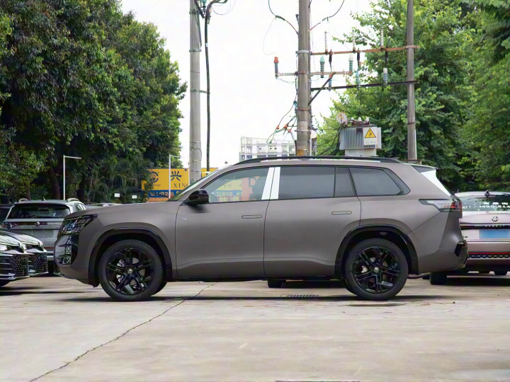 再来看车身侧面部分,车身侧面延续了途昂家族的 “力量美学”:5158mm 的超长车身搭配平直的车顶线条,为三排座椅的头部空间提供充足保障,1991mm 的车宽更强化了视觉上的安全感。最亮眼的升级是新增隐藏式电动门把手,解锁时自动弹出,既降低了风阻系数,又让侧面线条更显简洁流畅。车顶行李架与车身同色设计提升整体性,搭配 18-21 英寸多规格轮毂,其中 21 英寸双色轮毂与哑光棕色车身的组合,将豪华与运动感平衡得恰到好处。值得一提的是,虽然车身庞大,但配合降低 30mm 的门槛高度,老人孩子上下车无需过度弯腰,实用性远超同级。