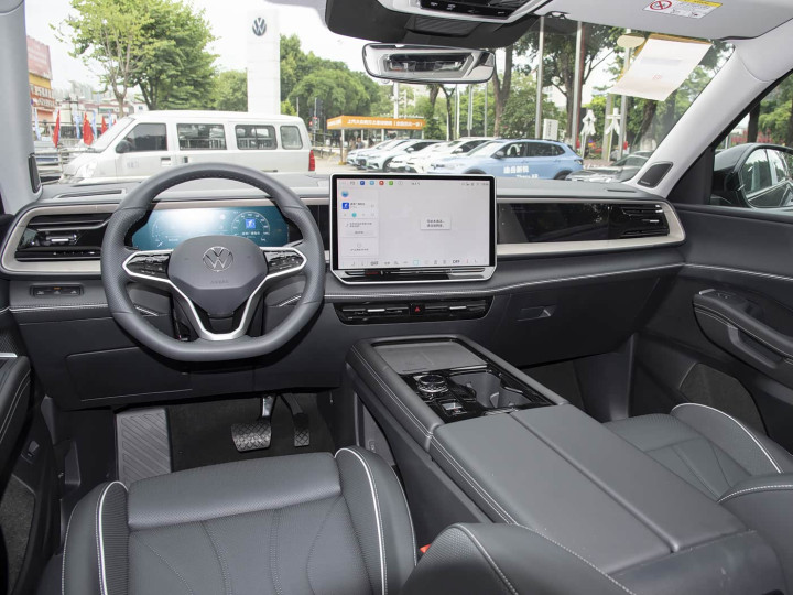 进入车内,内饰是途昂 Pro 的 “智能升级主战场”,六屏联动数字座舱彻底颠覆了传统燃油车的交互体验。15 英寸 2K 悬浮中控屏、10.3 英寸全液晶仪表盘与 11.6 英寸副驾娱乐屏形成横向视觉带,配合抬头显示、后排娱乐屏与手机互联,构建起全方位智能交互空间。搭载的 MOS 3.0 GP 智慧车联系统接入 DeepSeek 大模型,空间布局上延续 2+3+2 七座设计,前排 “云柔环绕” 座椅质感细腻,女王副驾配备电动腿托与按摩功能,长途乘坐疲劳感大幅降低。第二排座椅支持前后 180mm 滑动,配合可一键放倒的第三排,空间灵活性十足。